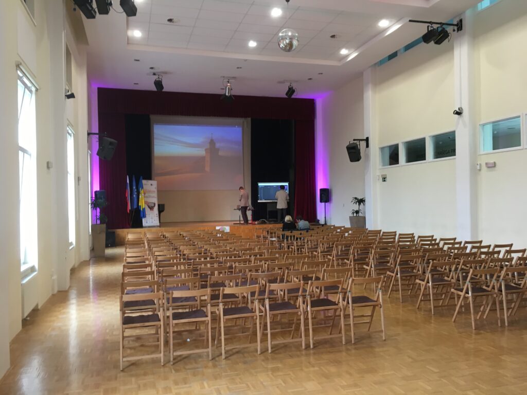 Dvorana je moderno opremljena z ozvočenjem, velikim projekcijskim platnom, velikim odrom in odrsko lučjo. Na voljo je LAN internetna povezava in brezžična povezava, tabla s papirjem, velika bela magnetna tabla…skratka vse kar potrebujete za dobro izvedbo seminarja ali izobraževanja.
